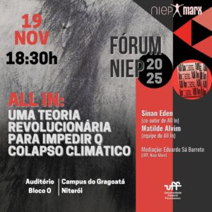 A convite do Núcleo Interdisciplinar de Estudos e Pesquisas sobre Marx e o Marxismo da Universidade Federal Fluminense, no dia 19 de Novembro o Sinan Eden (co-autor de All In) e a Matilde Alvim (da equipe do All In) estiveram a apresentar o livro recentemente editado no Brasil, All In: Uma Teoria Revolucionária para Interromper o Colapso Climático.