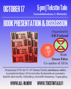 On October 17, Sinan Eden will be in Helsinki to present and discuss All In, in an event organized by XR Finland. The discussion is aimed at all activists, movements, and communities in Finland. Entry in the event will be free. Join us from 17pm until 19pm on a discussion on how to stop climate collapse.