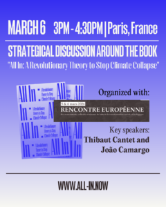 A strategical conversation with book presentation and exchanges on strategies to prevent climate chaos. João Camargo and Thibaut Cantet will be hosting this session.